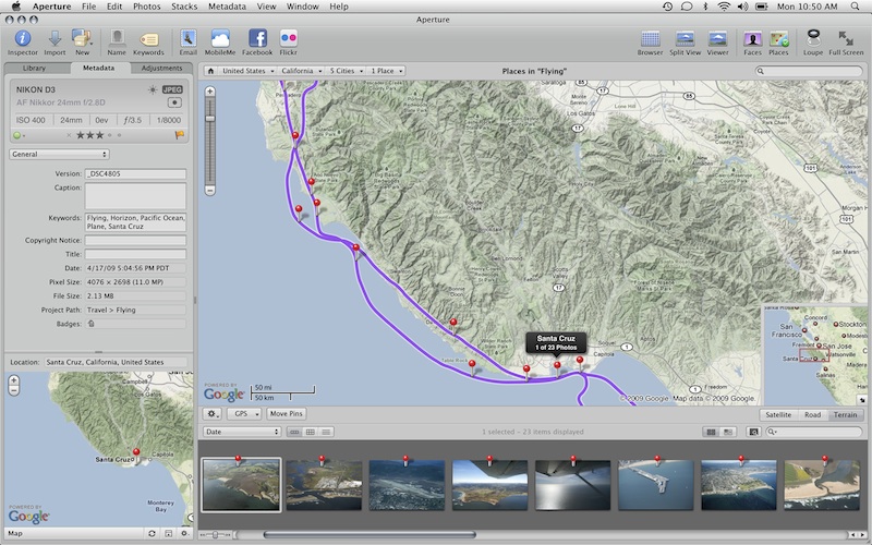 Borrowing from my experience testing the iPhoto implementation of Places I assisted the Aperture team in testing PLaces. Aperture's implementation is more sophisticated which often required making various KML files and even my own personal GPS work to test extreme situations (logging 1.5 million location points). I also assisted with the extensible library feature.